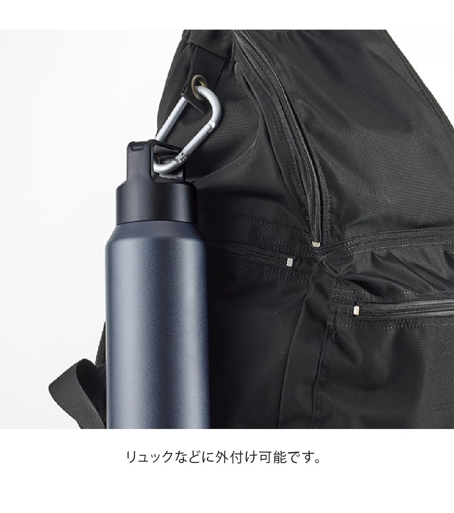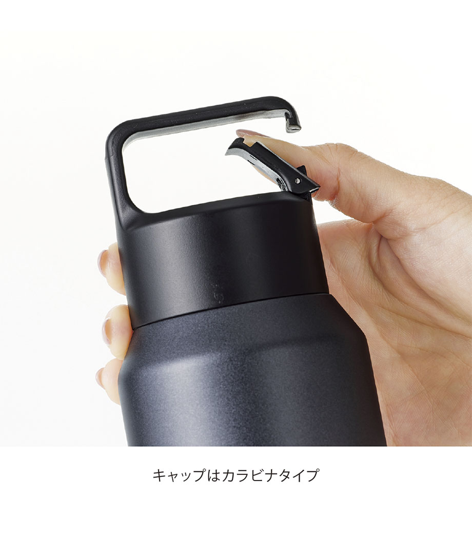 キャップはリュックなどに付けられる、便利なカラビナタイプ。底面は滑り止め付きで、テーブルなどに置いても安定感があります。メタリックなボディがスタイリッシュです。アウトドアやスポーツシーンなど、アクティブなライフスタイルのお供にピッタリ!