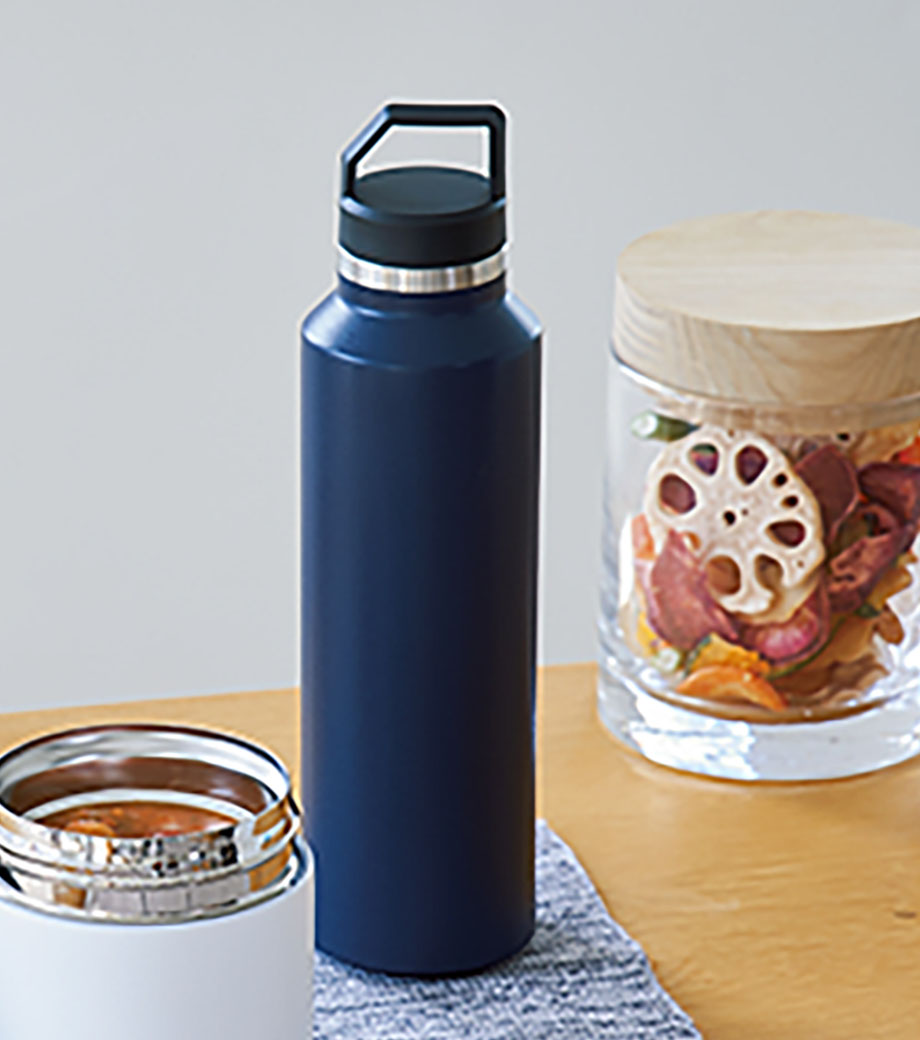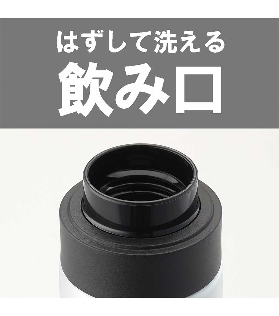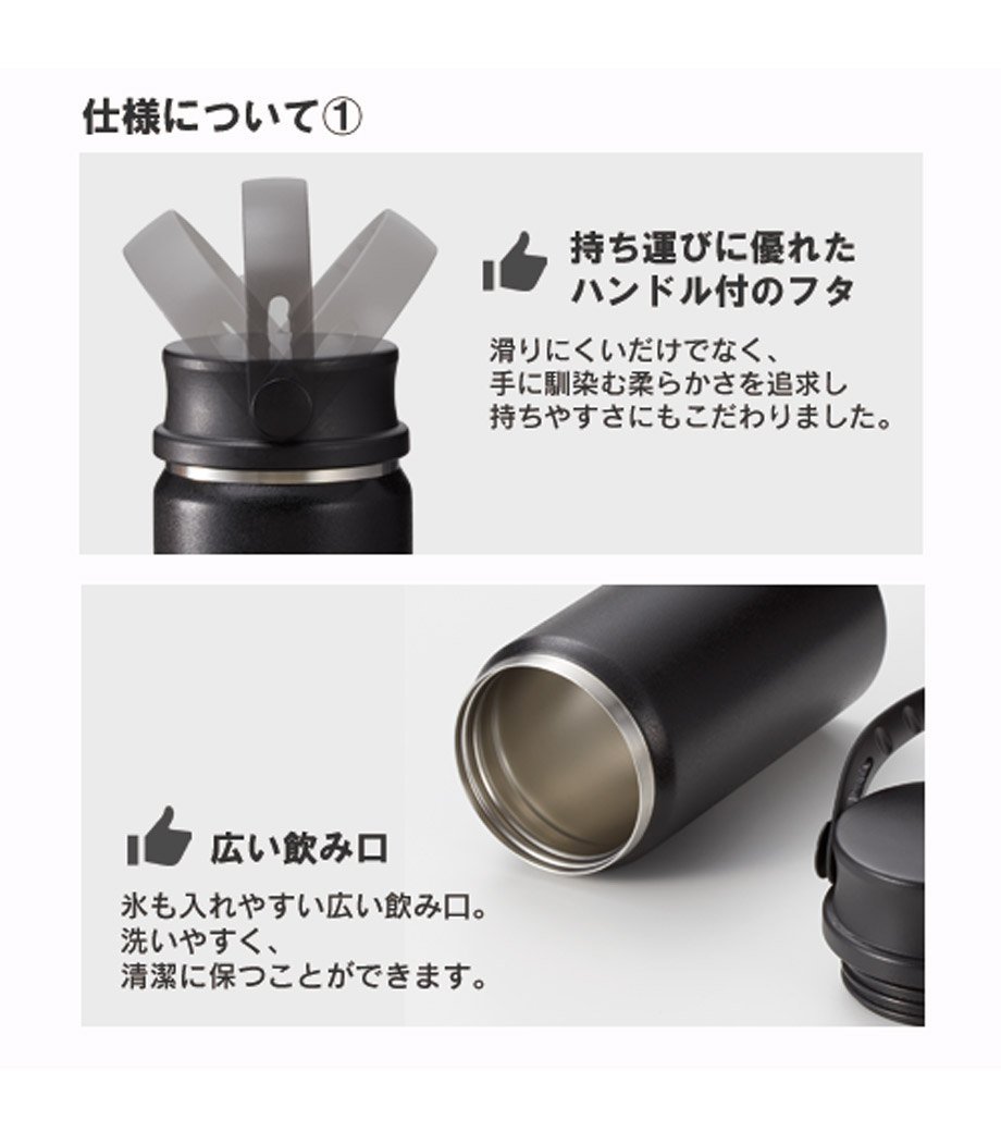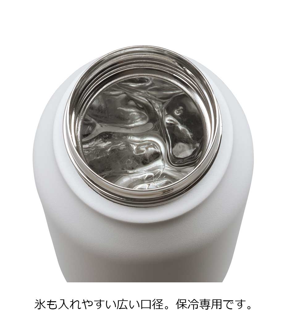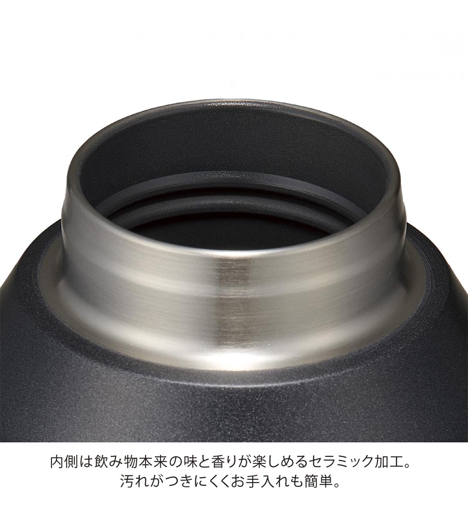 飲み頃温度を長時間キープできる真空二重構造です。広口でコップのような心地よい飲みやすさが魅力。蓋は持ち運びに便利なハンドル付きで、密閉しやすいスクリュー形状です。表面は少しザラっとしたマットな質感で、ニュアンスカラーがおしゃれ。