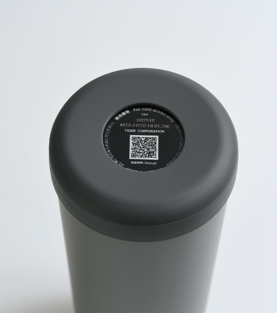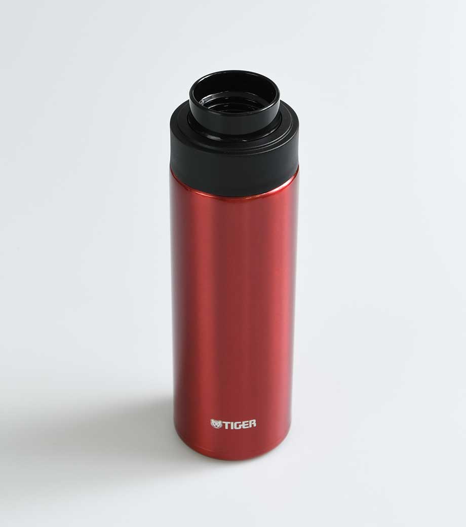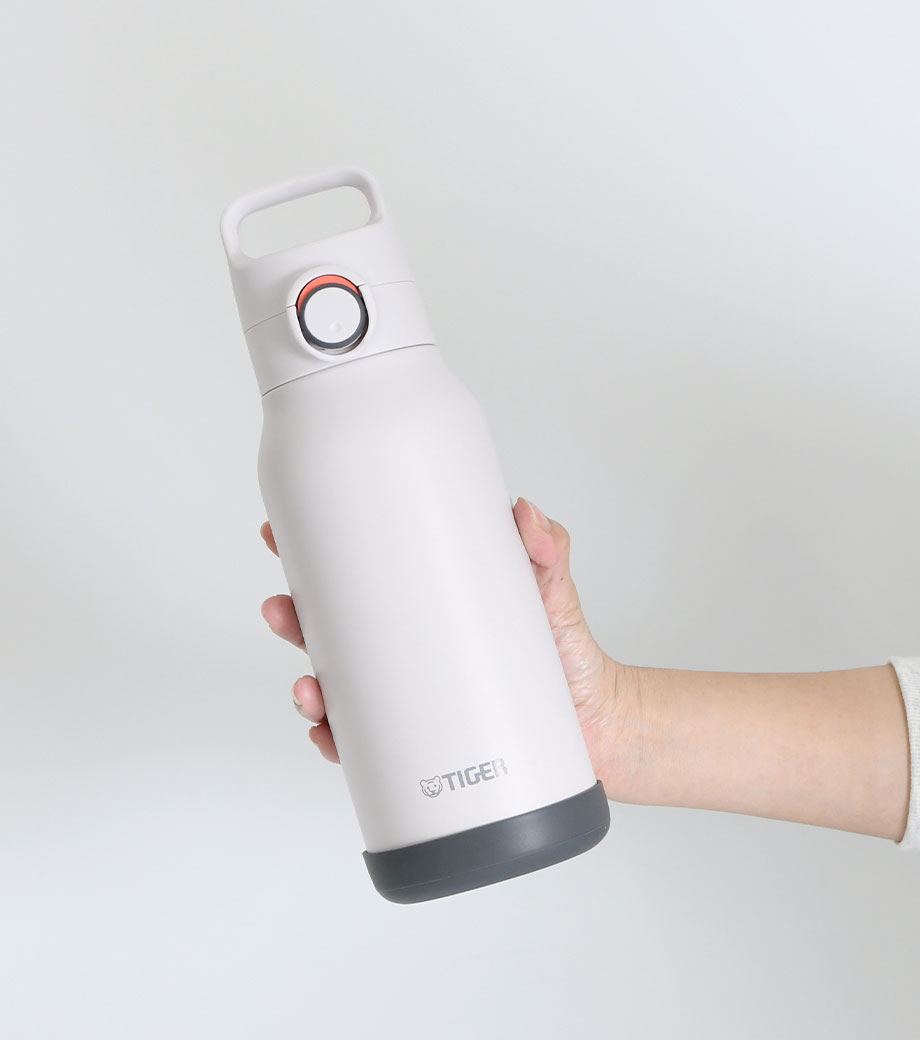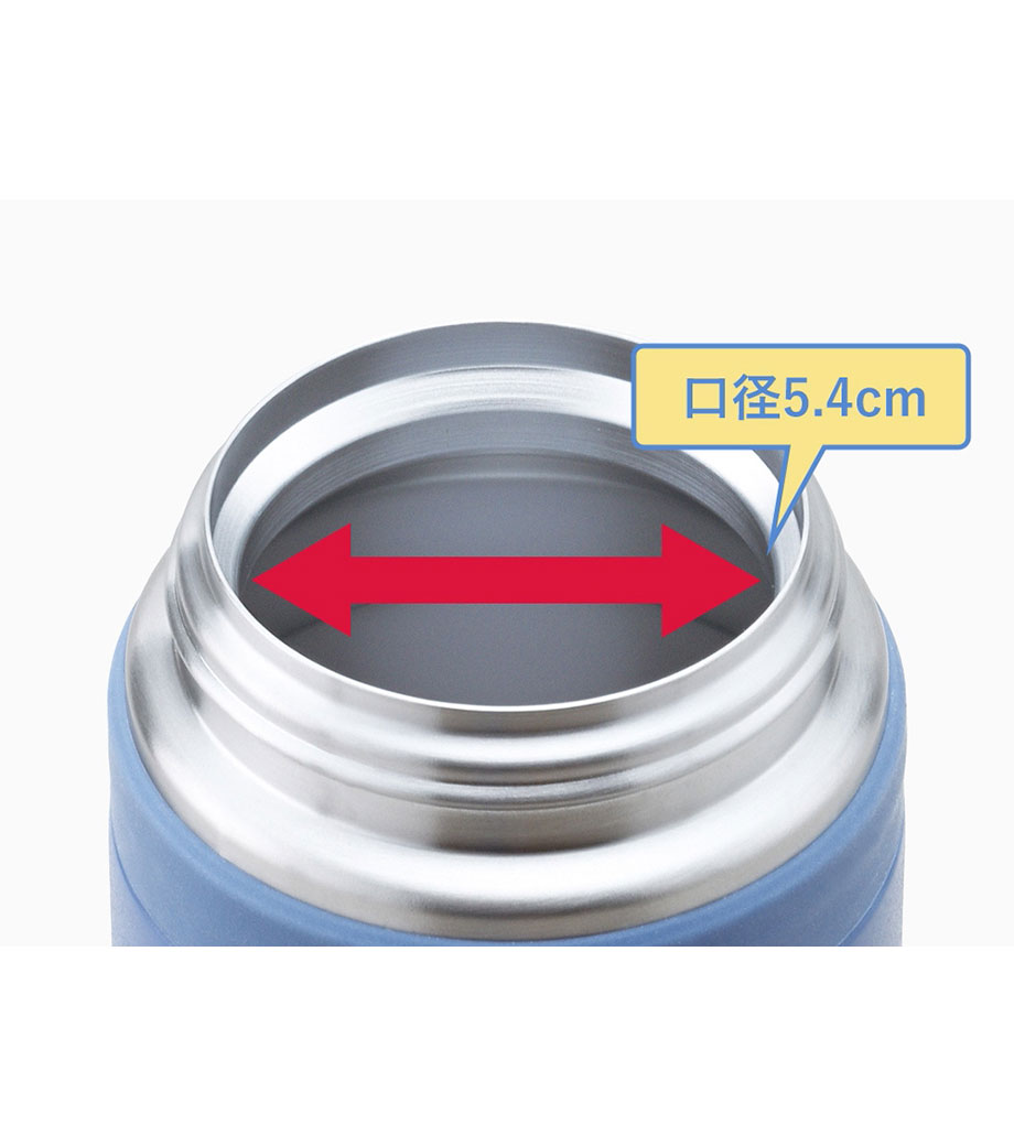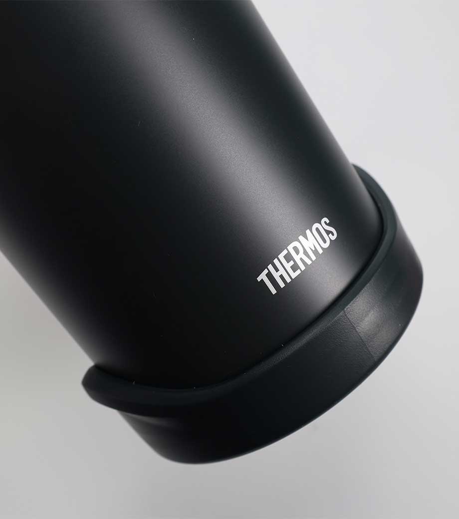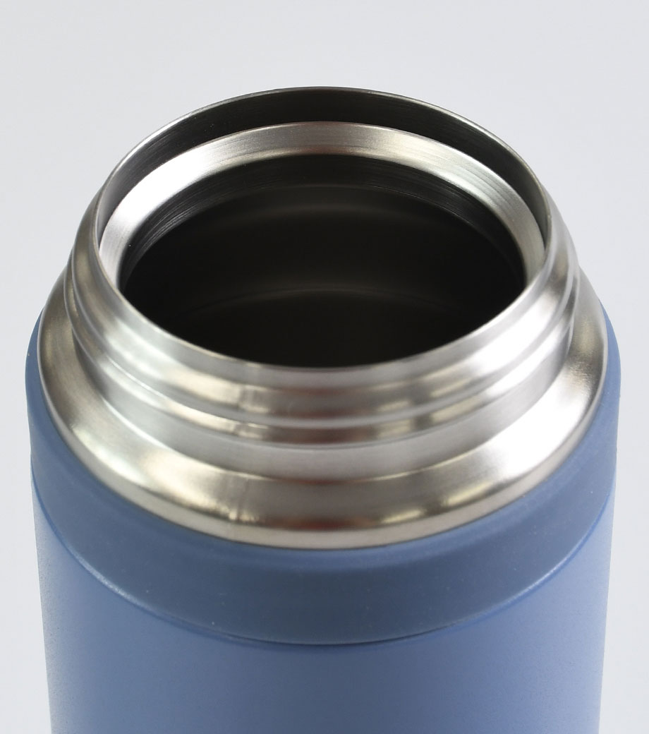 飲み頃温度を長時間キープできる真空二重構造です。広口でコップのような心地よい飲みやすさが魅力。蓋は持ち運びに便利なハンドル付きで、密閉しやすいスクリュー形状です。表面は少しザラっとしたマットな質感で、ニュアンスカラーがおしゃれ。