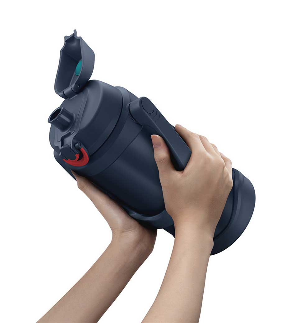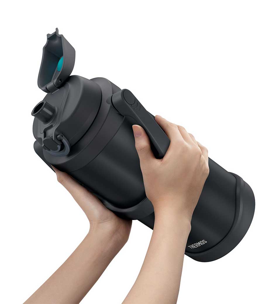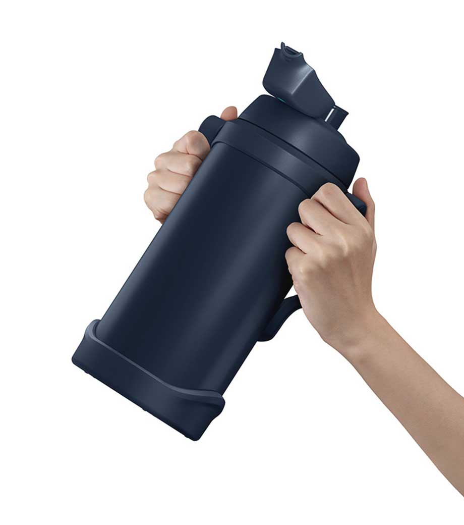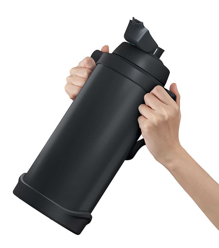 大容量でも持ち運びやすい、ハンドル付きの保冷ジャグです。約2.0Lでスポーツ時の水分補給にしっかり対応。魔法びん構造により冷たさをキープします。ワンタッチで開けて直飲みでき、両手で支えて飲める「ラク持ちハンドル」仕様です。大きな氷も入ってお手入れしやすい広口設計。キャップユニットは食洗機対応です。