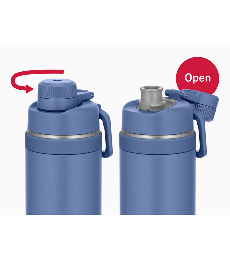 容量約750mlの保冷専用ボトル。持ち運びやすいループが便利。一捻りでオープンできる直飲みタイプです。スポーツドリンク対応。広い口径で氷が入れやすく、保冷効果が長持ちします。本体上部と底部にシリコンカバーが付いていて、握りやすく衝撃に強いのが特徴です。