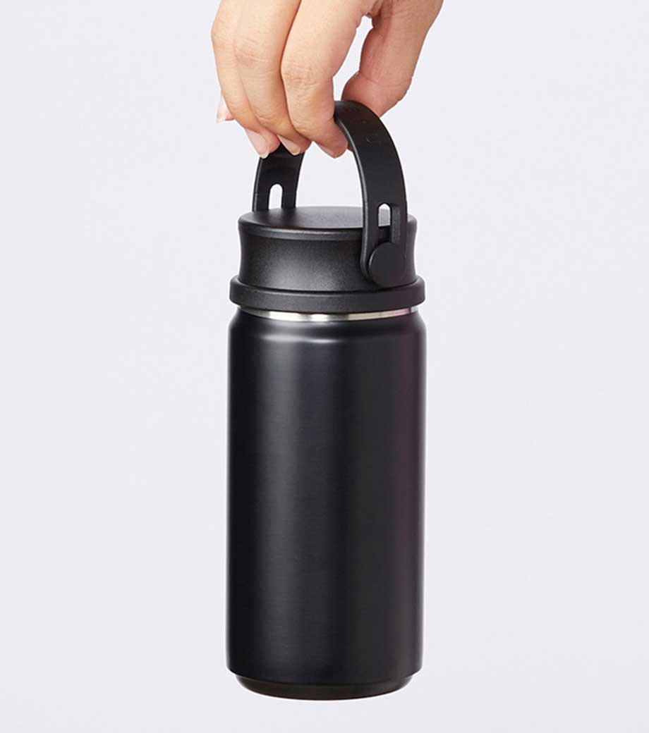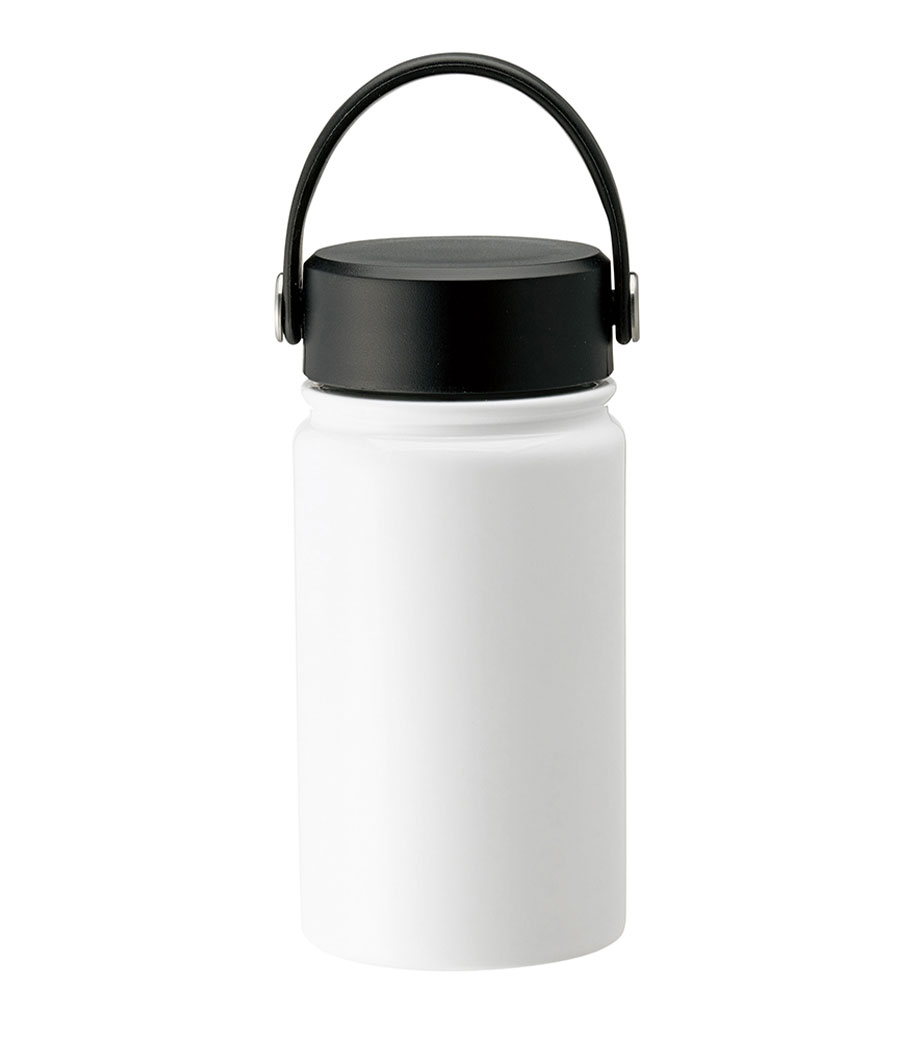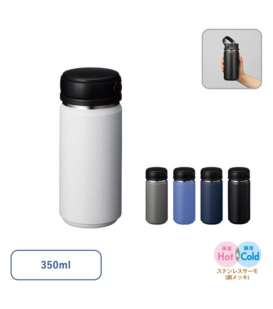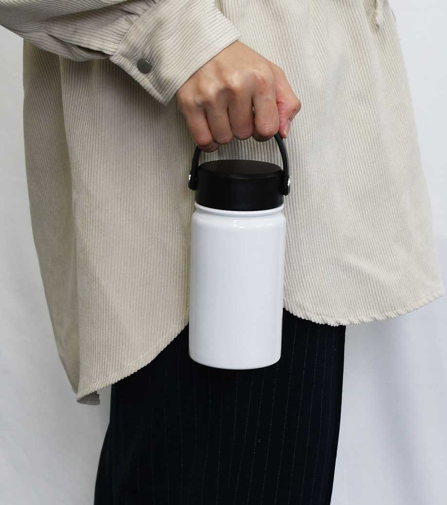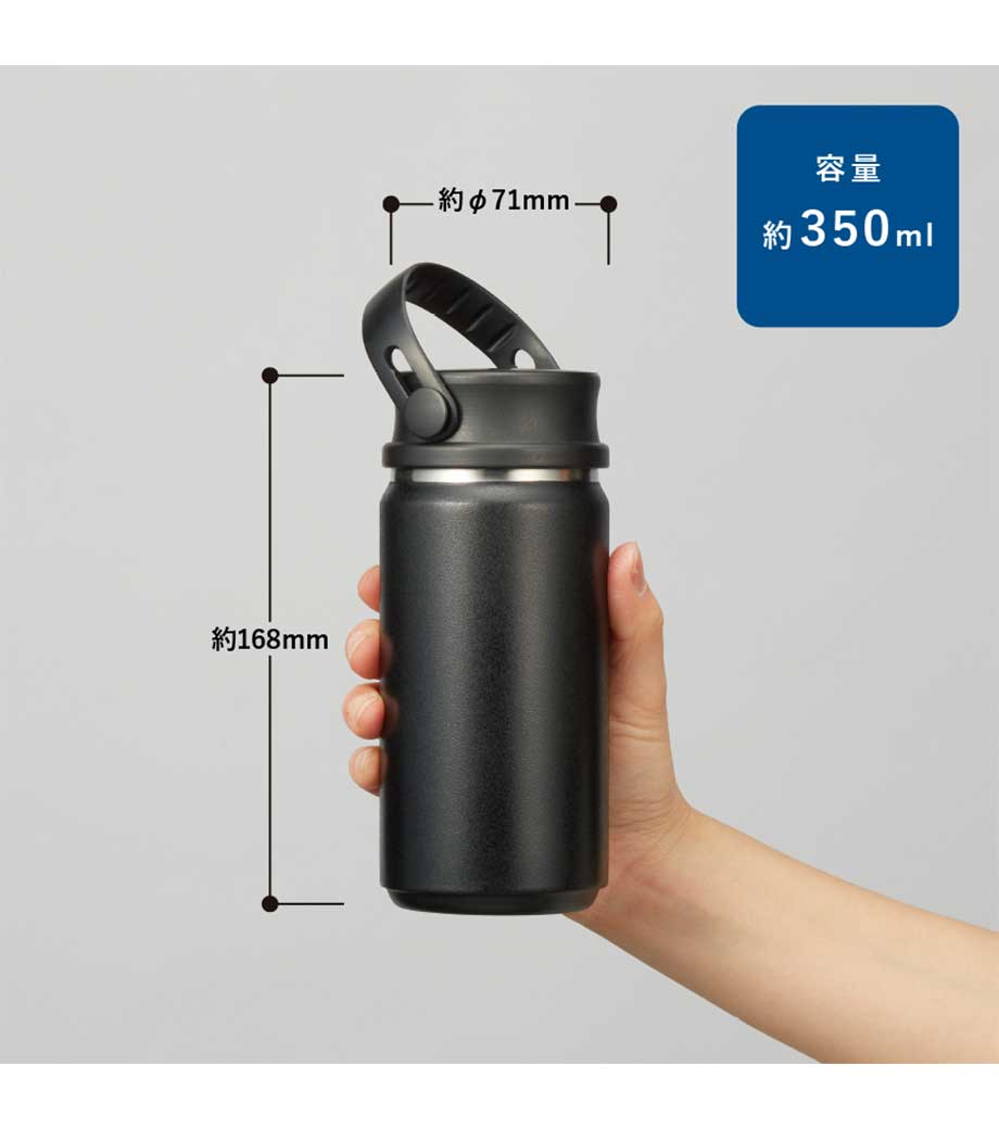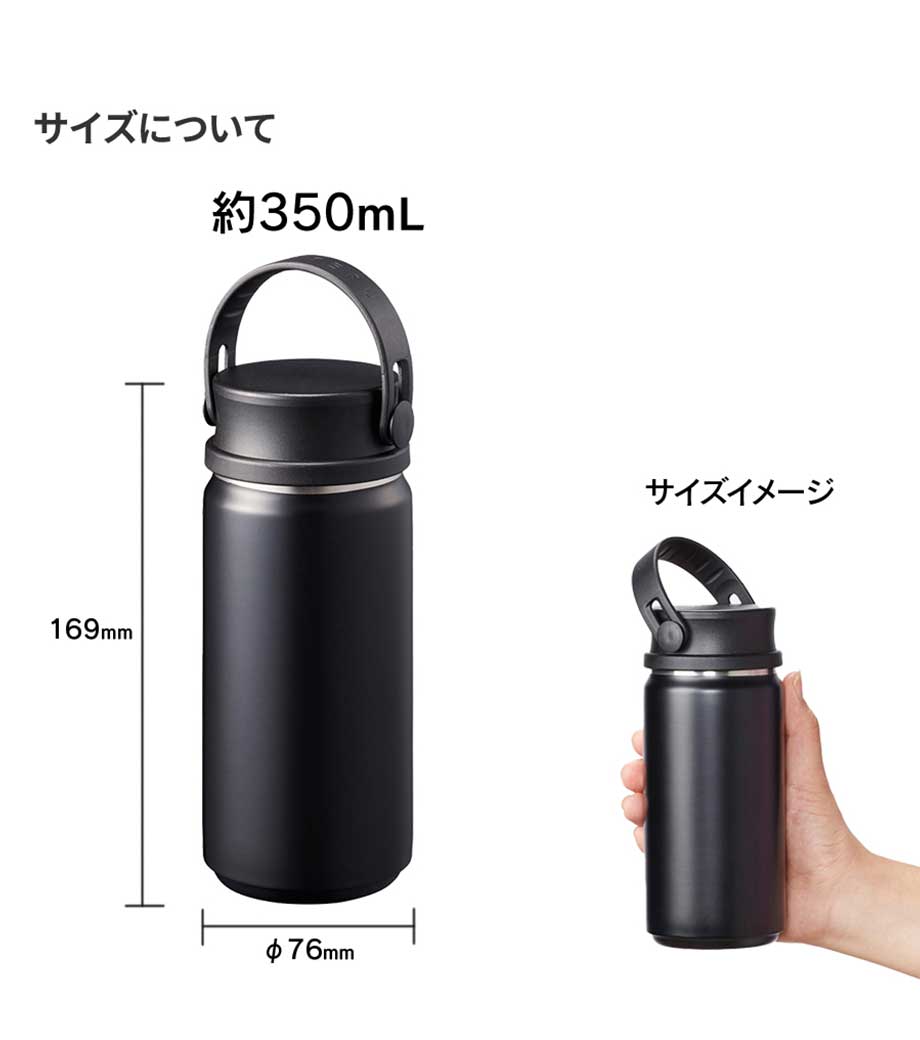 ハンドル付ステンレスボトルは、保冷温効果が高く、飲み頃温度をキープしてくれる真空二重構造。小ぶりのペットボトルと同程度の350mlで、ちょっとしたお出かけにも使いやすい容量です。持ち運ぶのに便利なハンドル付きなので、アウトドアやジムでの水分補給にも使えます。