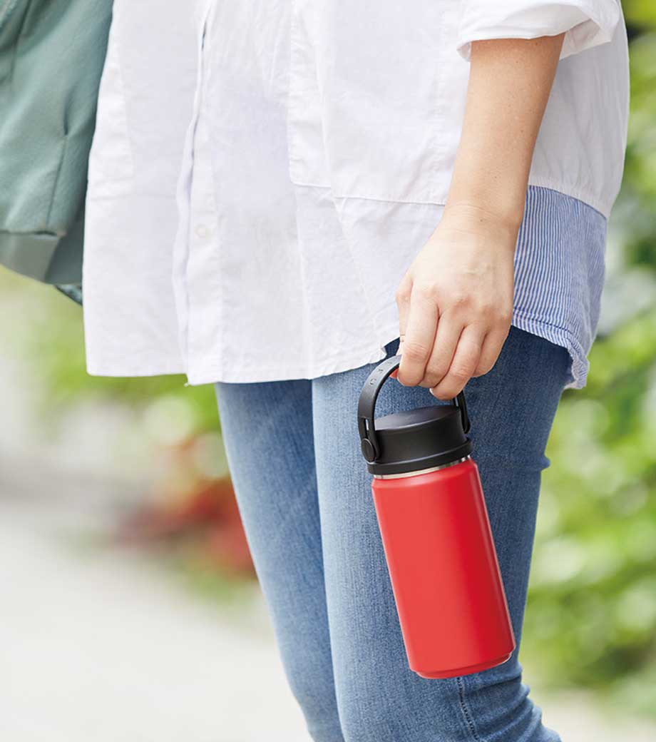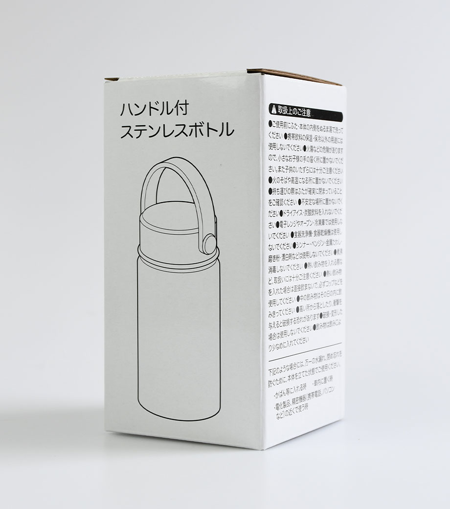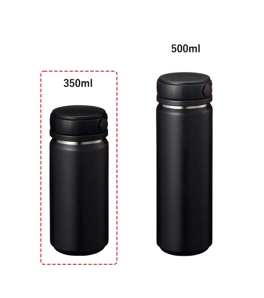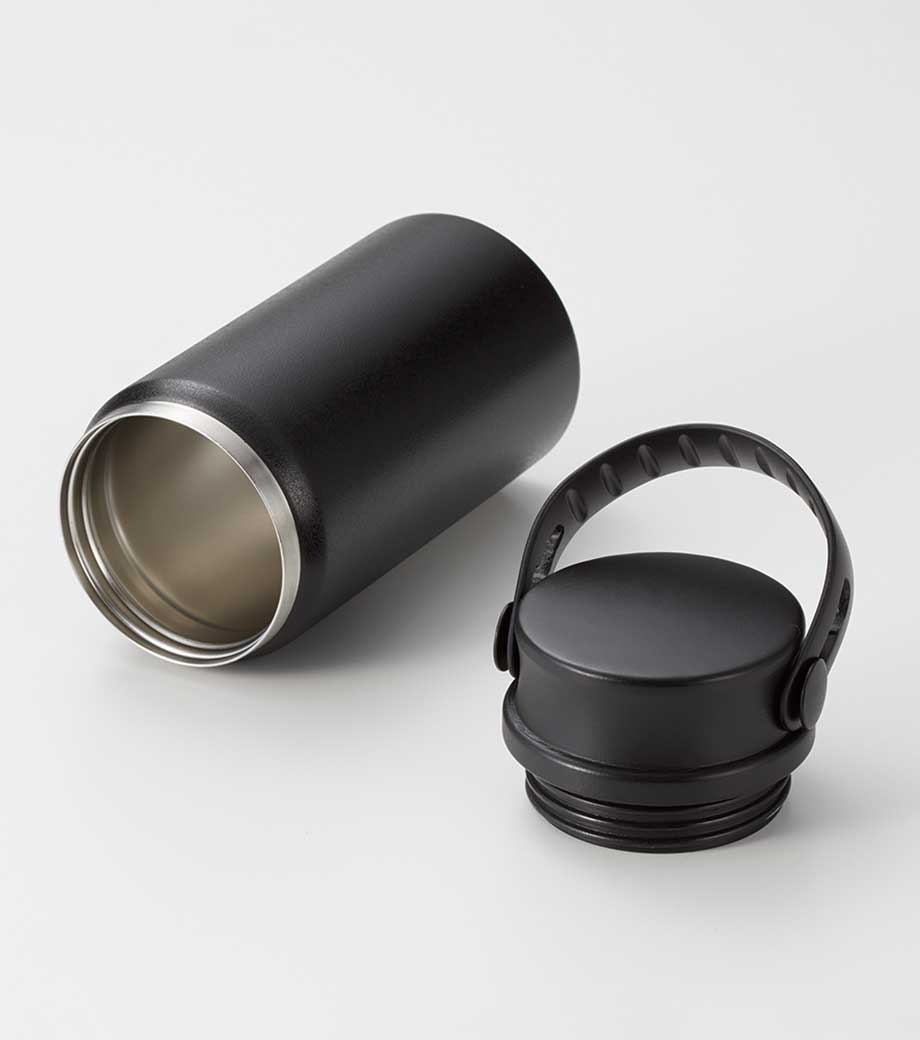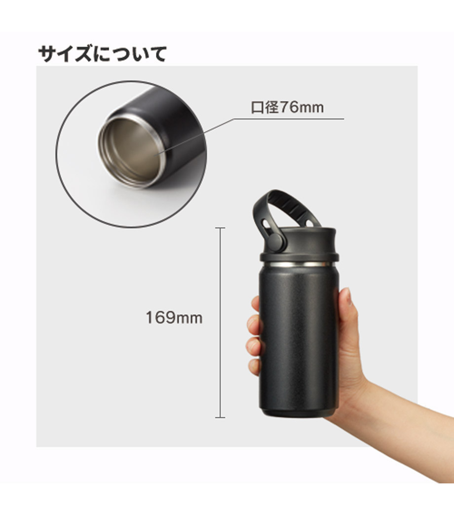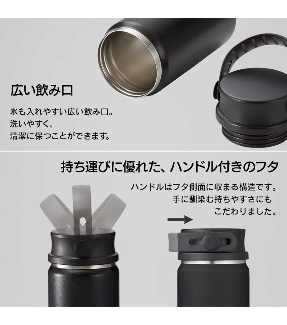 ハンドル付ステンレスボトルは、保冷温効果が高く、飲み頃温度をキープしてくれる真空二重構造。小ぶりのペットボトルと同程度の350mlで、ちょっとしたお出かけにも使いやすい容量です。持ち運ぶのに便利なハンドル付きなので、アウトドアやジムでの水分補給にも使えます。