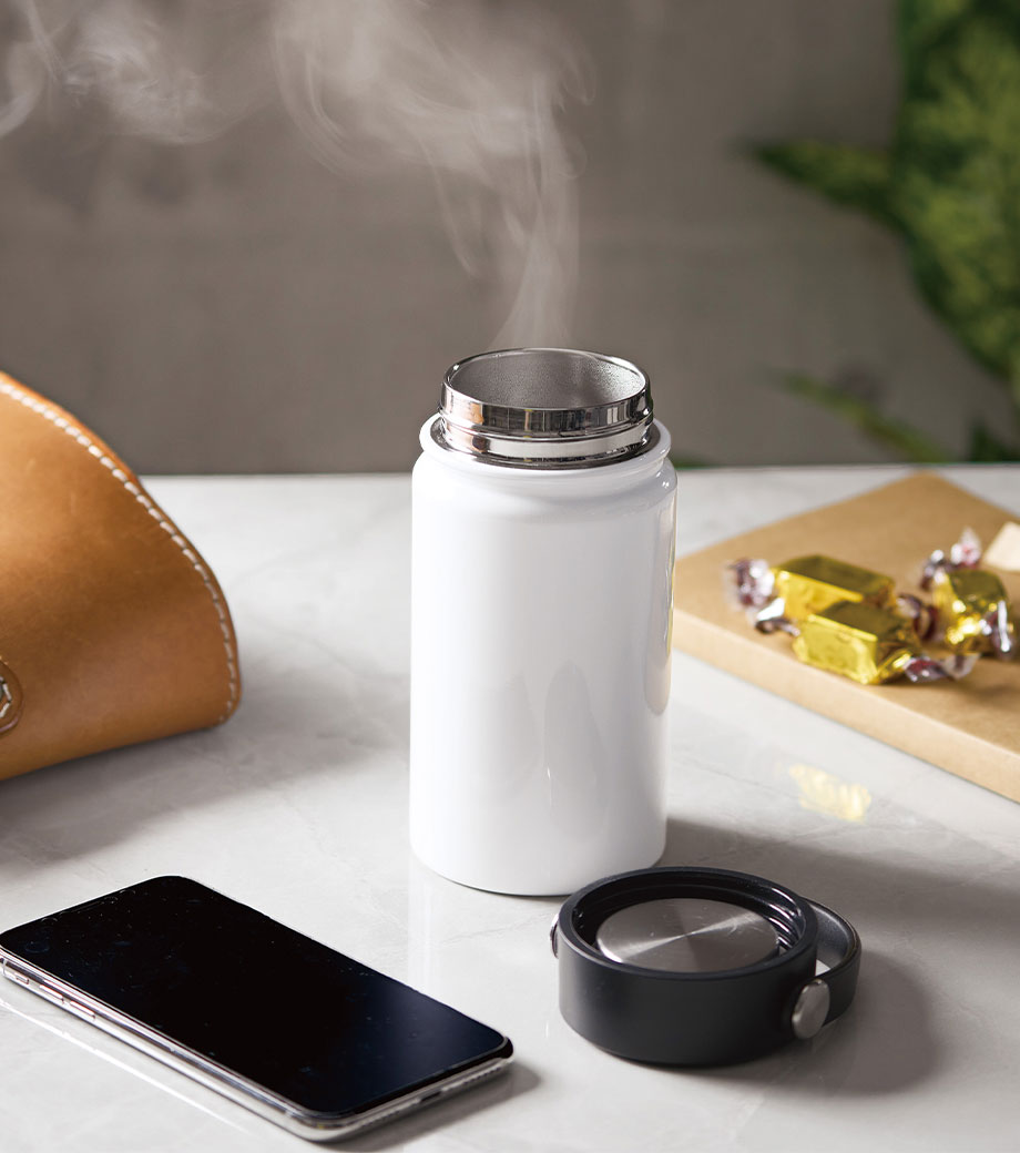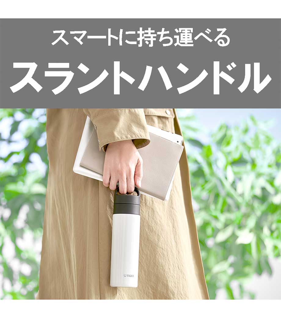 ハンドルとフタが一体化したタンブラーです。両手がふさがっていてもハンドルに指をひっかけて持ち運べるので、会議などオフィスでのちょっとした移動の際に便利!真空二重構造なので飲み頃の温度をキープしてくれます。大きめの氷も入る広口設計。外出先での水分補給にも十分な容量約360mlで、暑さ対策アイテムとしてもおすすめです。