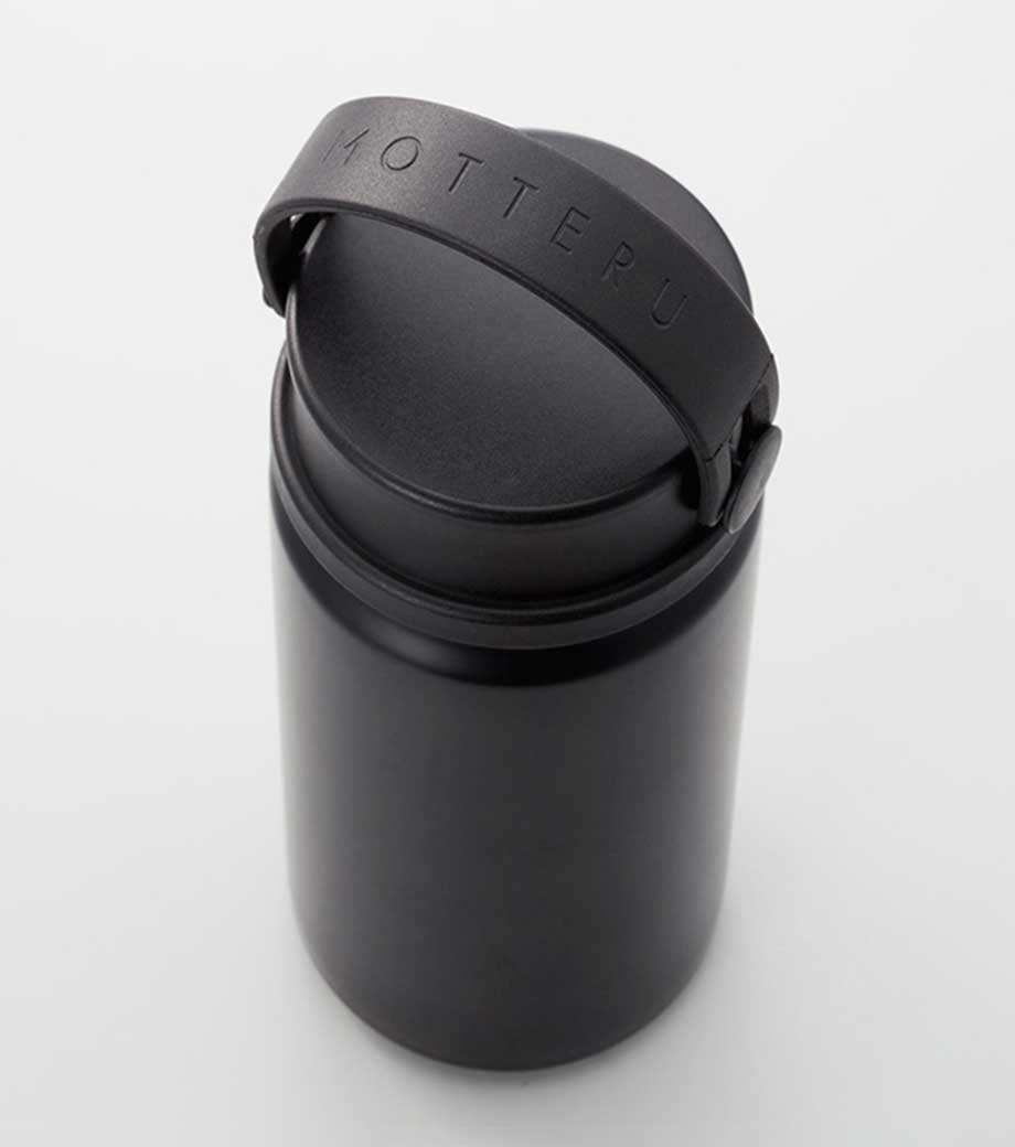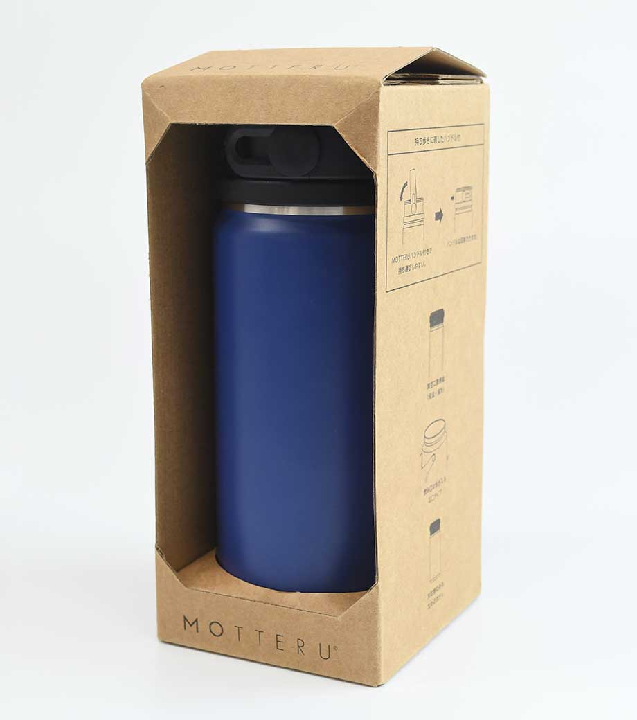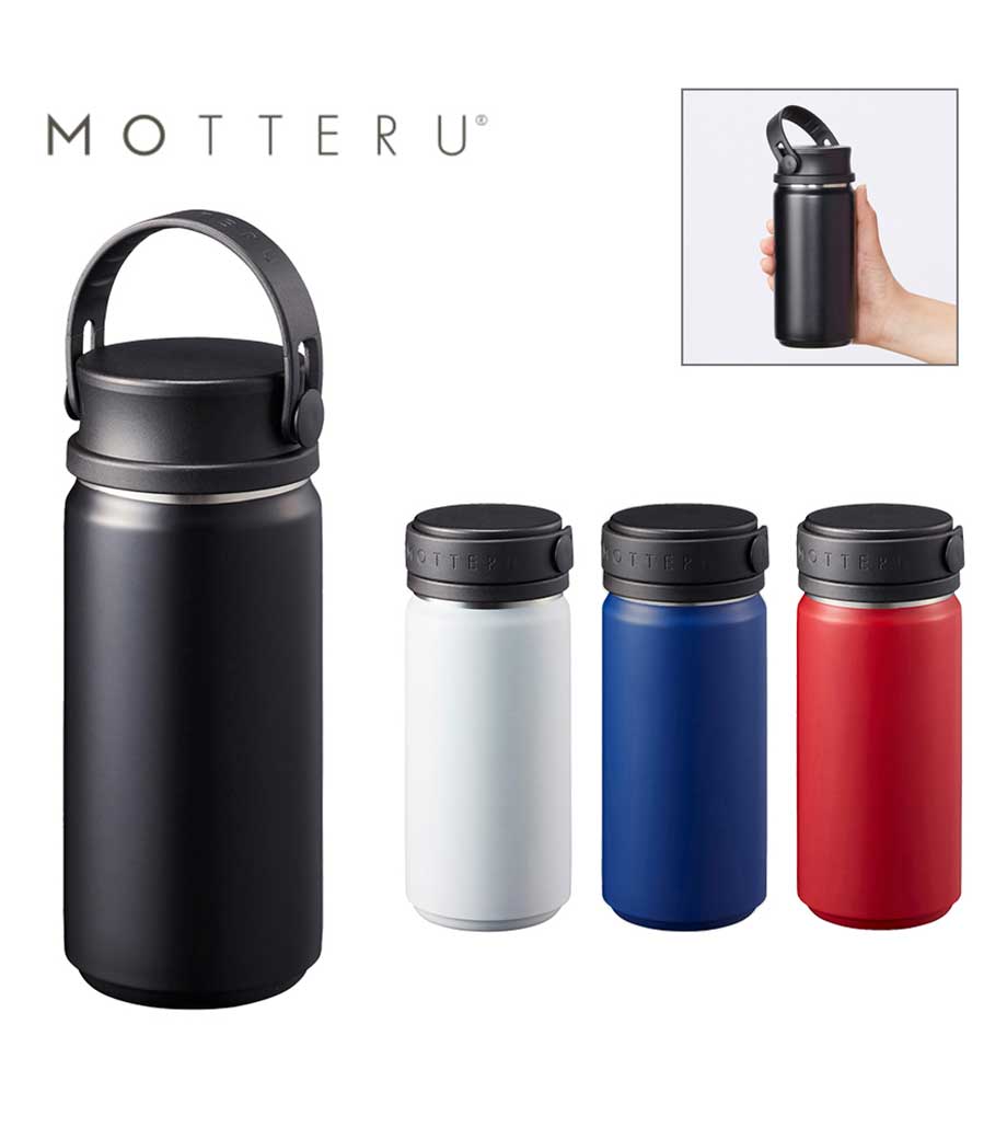 MOTTERU サーモハンドルスタイルボトル 350mlは、真空二重構造なので飲み物の保冷・保温機能に優れています。キャップ部分はハンドル付きで持ち運びやすく、スポーツシーンやレジャーシーンにおすすめです。ハンドルは水平に倒してスライドさせることで収納可能。保管の際に邪魔になりません。