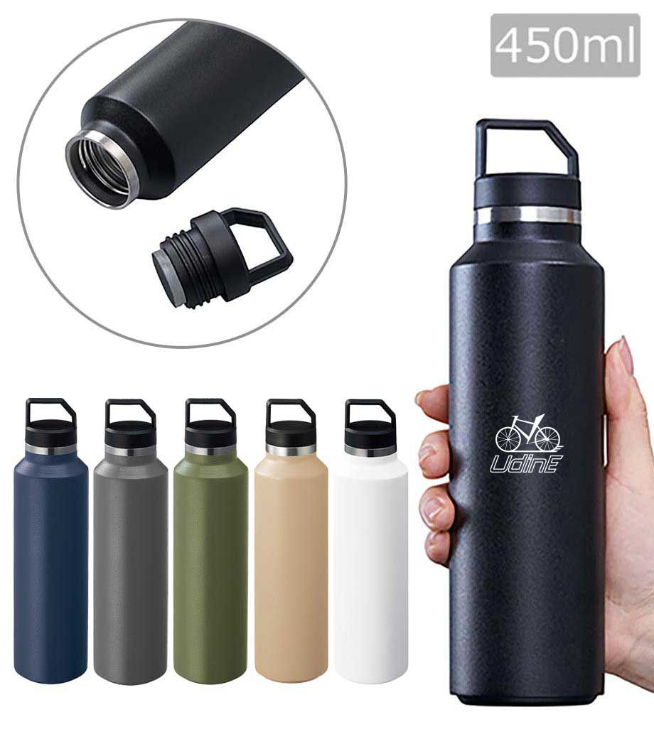 持ち運び便利なハンドル付きステンレスボトル。保温・保冷効果が長く続く真空二重構造です。容量は420mlでお出かけ時にしっかり水分補給ができるサイズ。アウトドアシーンに映えるクールなデザインで、老若男女問わずお使いいただけます。