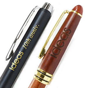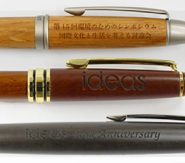 木製、金属製のボールペン、シャープペンシルにレーザー彫刻ができます。レーザー彫刻とは、木製や金属製の商品にレーザー光を照射することで、素材表面に文字や絵を彫刻する方法です。