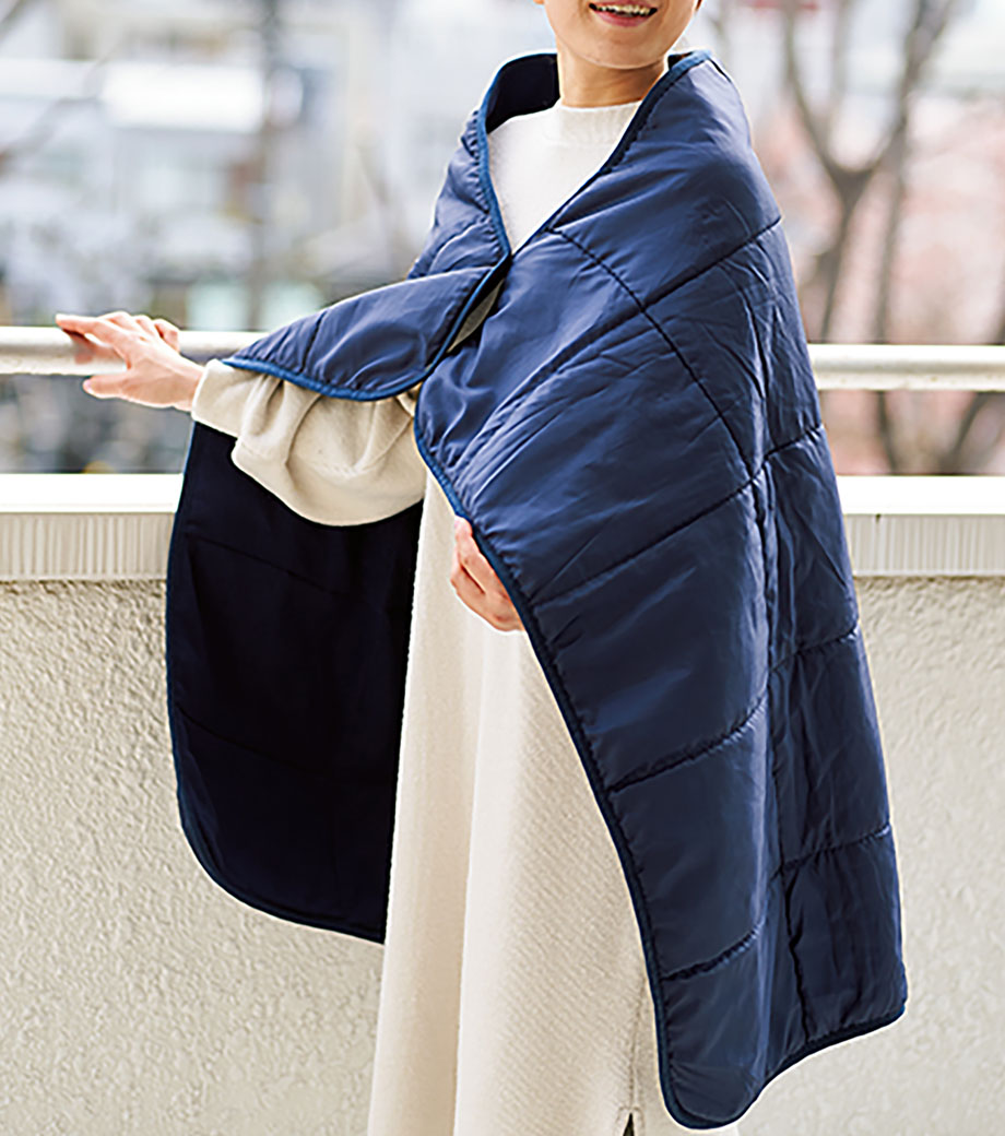 キルトフリースブランケット(巾着付)は、表はキルティング、裏はフリース素材に中綿が入った三層構造。ダウンジャケットのように暖かく、風を通しにくい極上ブランケットです。