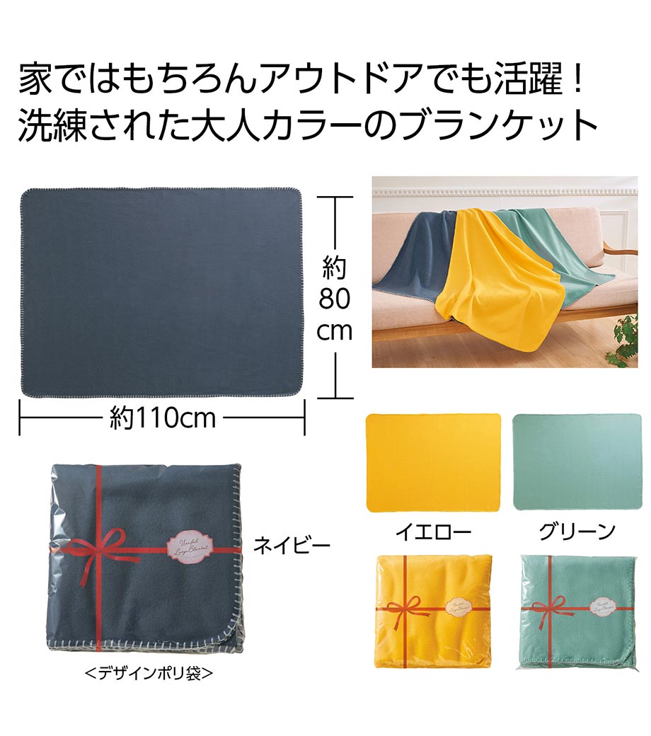 洗練された大人カラーが魅力の大きめブランケットです。大人のリラックスタイムや子どものお昼寝タイムにもぴったり。家ではもちろんアウトドアでもサッと羽織れて便利。プレゼントラッピングのようなパッケージデザインが印象的です。他と差が付く一味違ったノベルティでハイコスパなのも見逃せません。洗練された大人カラー3種取り混ぜでお届けします。アウトドアショップやディーラーのキャンペーンで配布してみませんか。