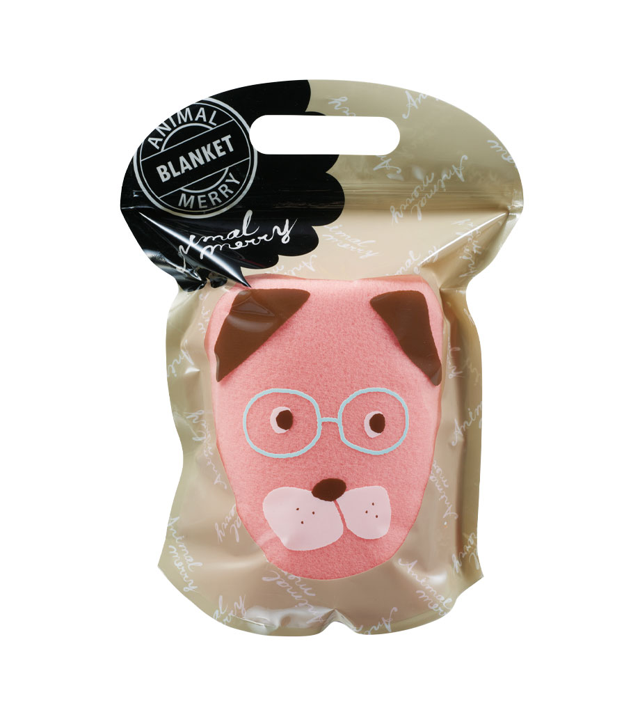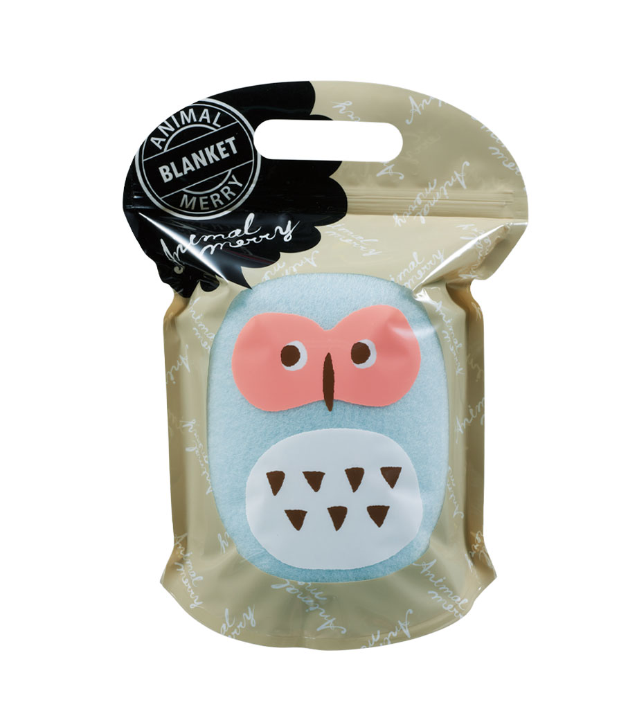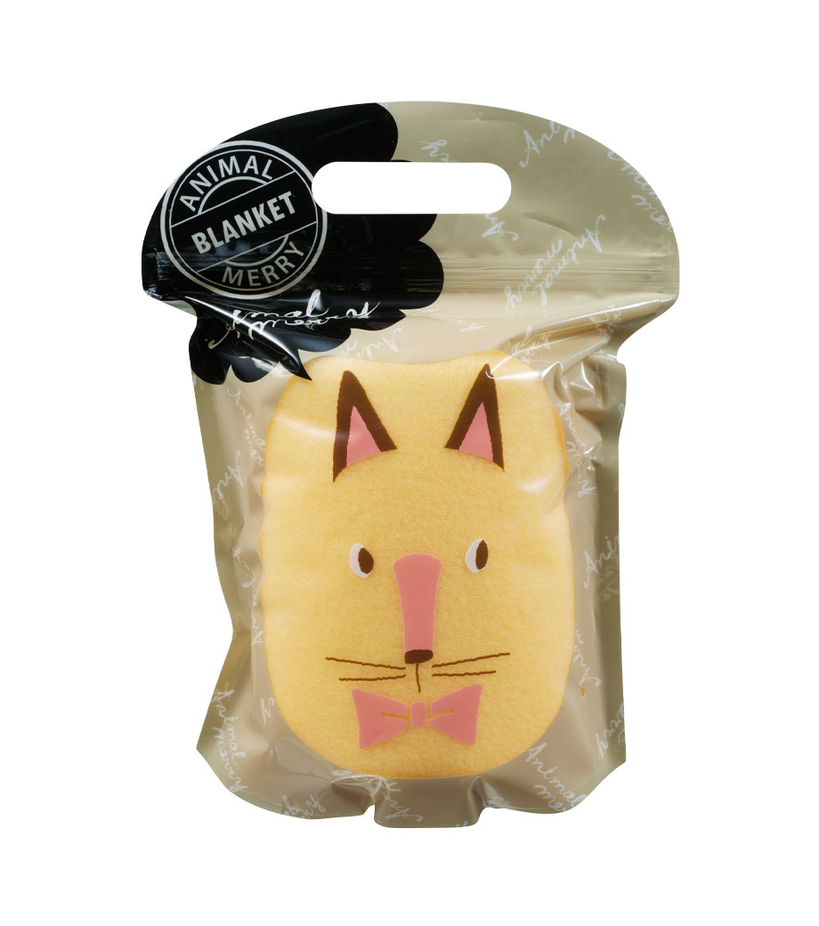4つの動物のパッケージがかわいいブランケットです。ブラウン(ネコ)・ブルー(フクロウ)・イエロー(キツネ)・レッド(イヌ)の4色取混ぜでお届け。どれにしようか選ぶ楽しさがあるノベルティです。小判抜きの持ち手つきのパッケージで、そのままお持ち帰りできます。