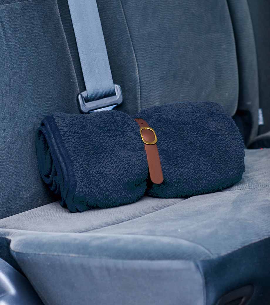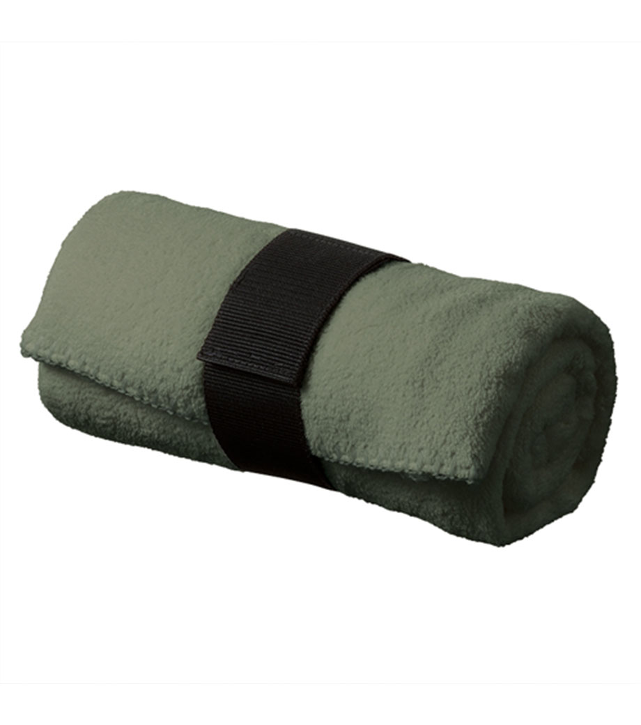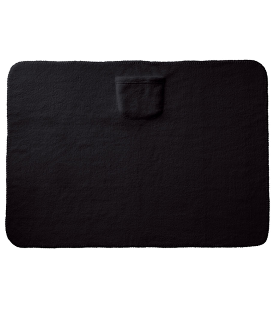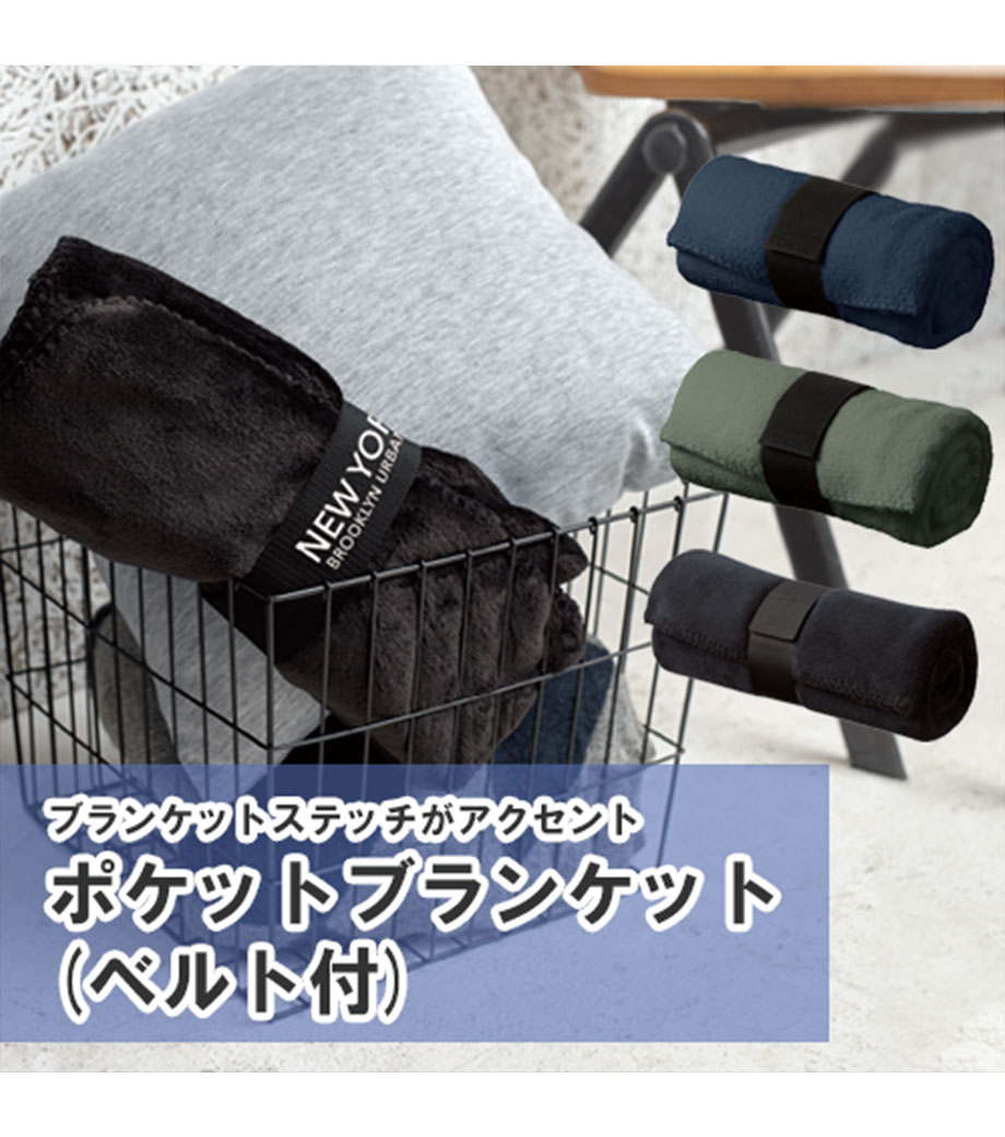 ひざ掛けにちょうどいいサイズのブランケット。面ファスナーで留められるベルト付きで、持ち歩き時はコンパクトにまとめられます。オフィスや車内の防寒対策にいかがでしょうか。定番のシンプルデザインで、男女問わずお使いいただけます。