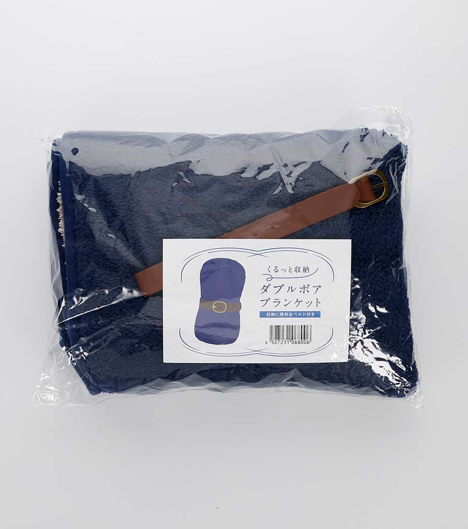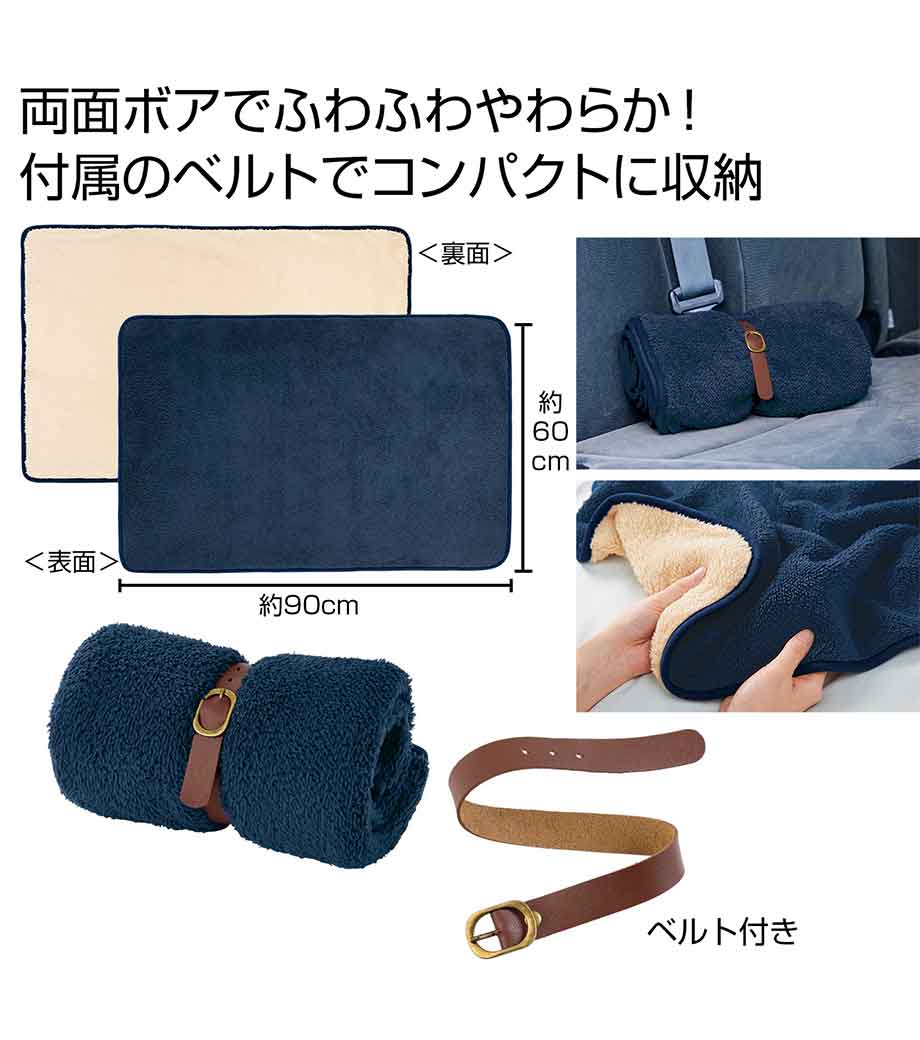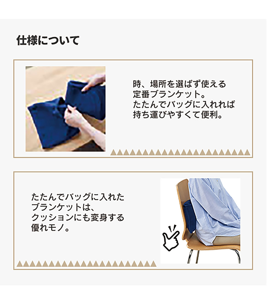ひざ掛けにちょうどいいサイズのブランケット。ベルト付きで、持ち歩き時はコンパクトにまとめられます。定番のシンプルデザインで、表面はネイビー、裏面はナチュラル。男女問わず使いやすい色使いです。オフィスや車内の防寒対策におすすめです。
