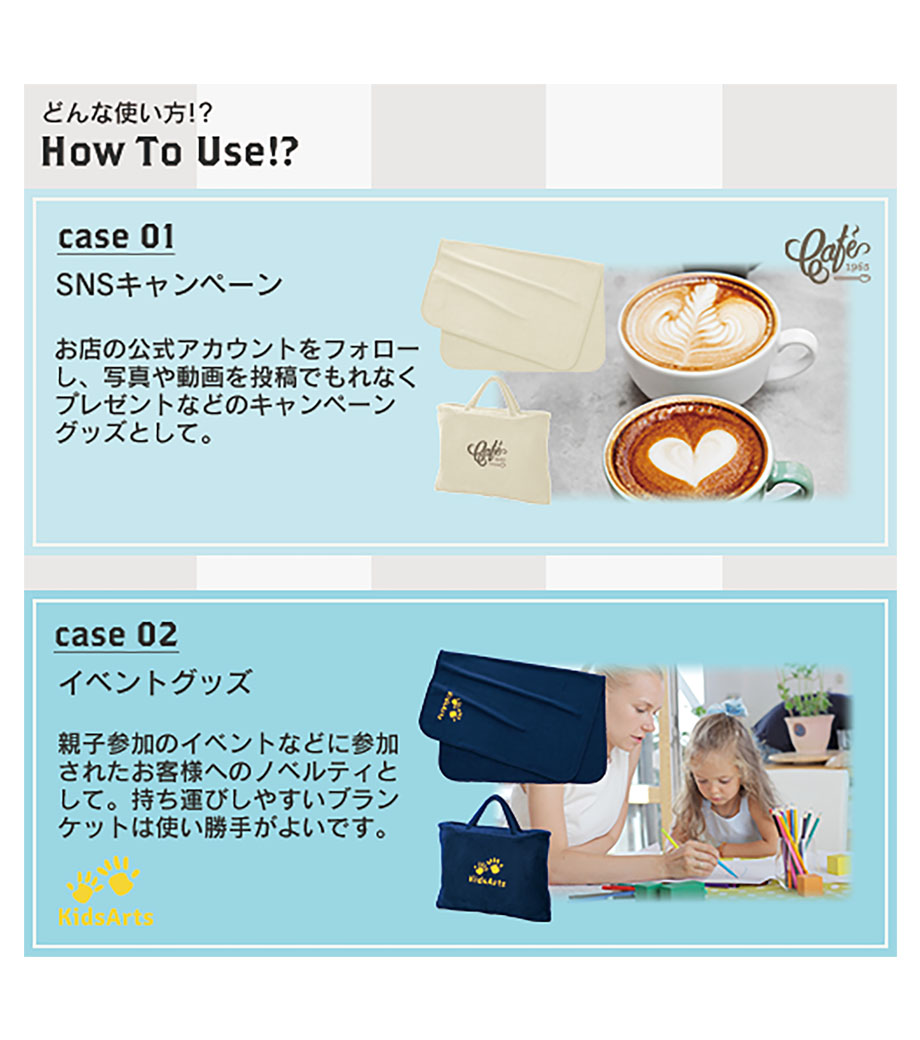 ブランケットに1色印刷ができます。住宅展示場などの家族向けイベントやキャンペーンにおすすめです。