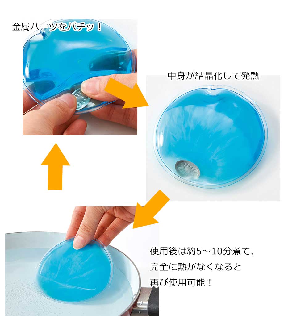 中の金属パーツをパチっとするとすぐに温まる不思議なカイロ。煮沸したお湯で煮ると元に液体状に戻り、繰り返し使えるエコな商品です。ハンカチ等でくるんで熱を逃さないようにすれば保温効果が長続き。約40度のあたたかさが1時間ほど続きます。