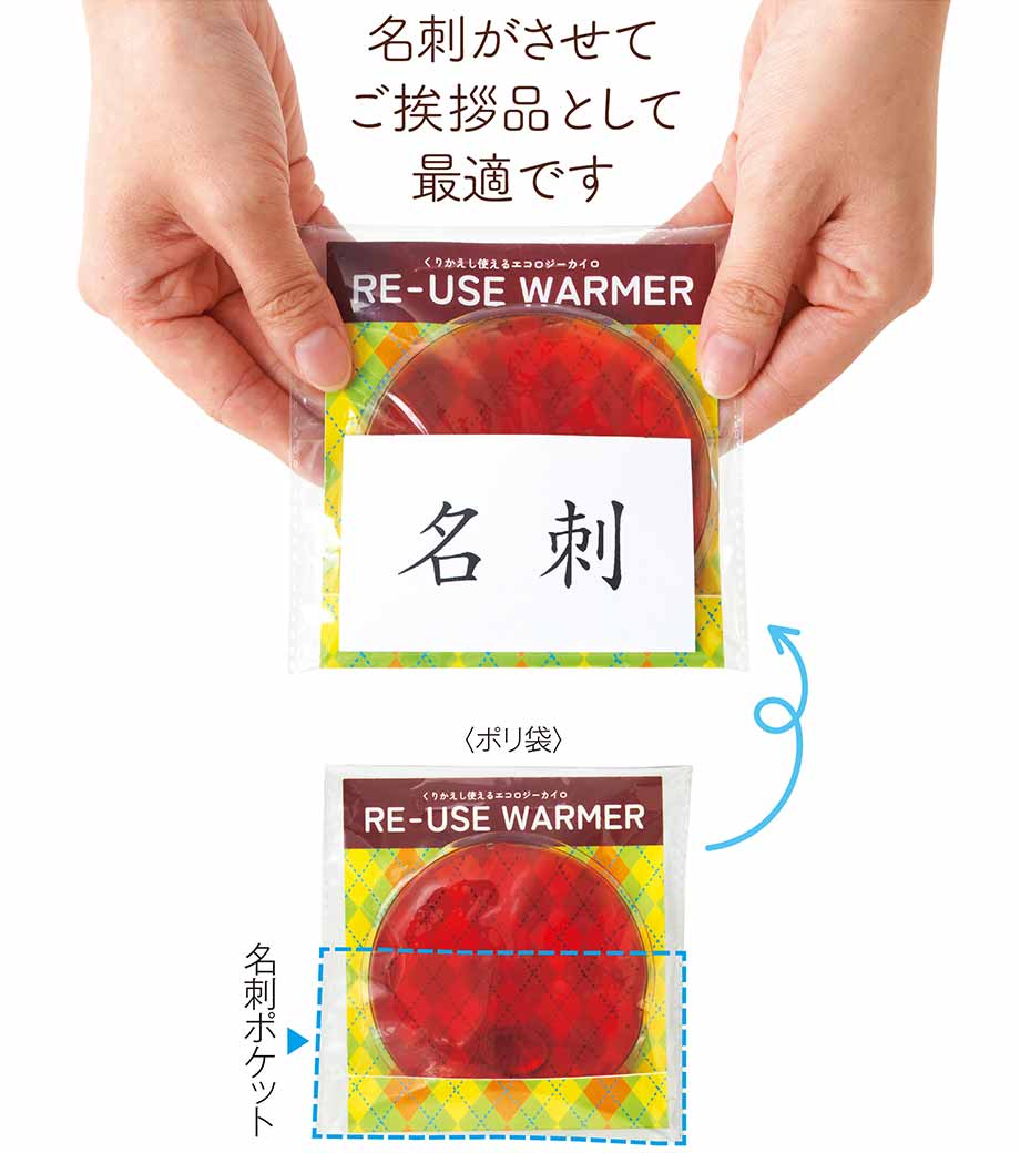 カイロ本体にオリジナル印刷が可能です。パッケージのポリ袋には便利な名刺ポケット付き。お店のクーポンを一緒に配布したりするのもおすすめです。お子さま向けの科学教材としても人気のある商品。イベントやキャンペーンの配布にいかがでしょうか。